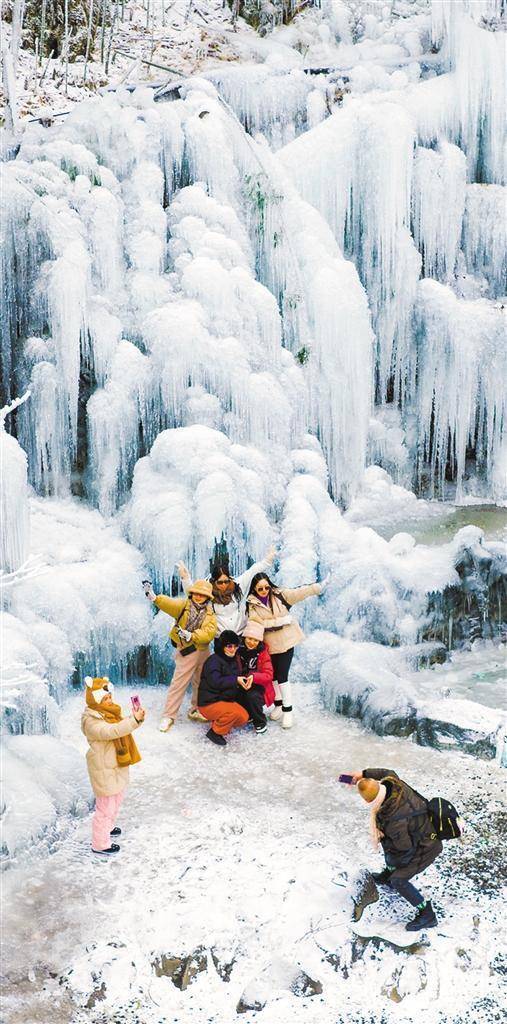 1月5日,重庆市南川区金佛山景区不雅霞台,晶莹晶莹的冰瀑诱惑旅客拍照。