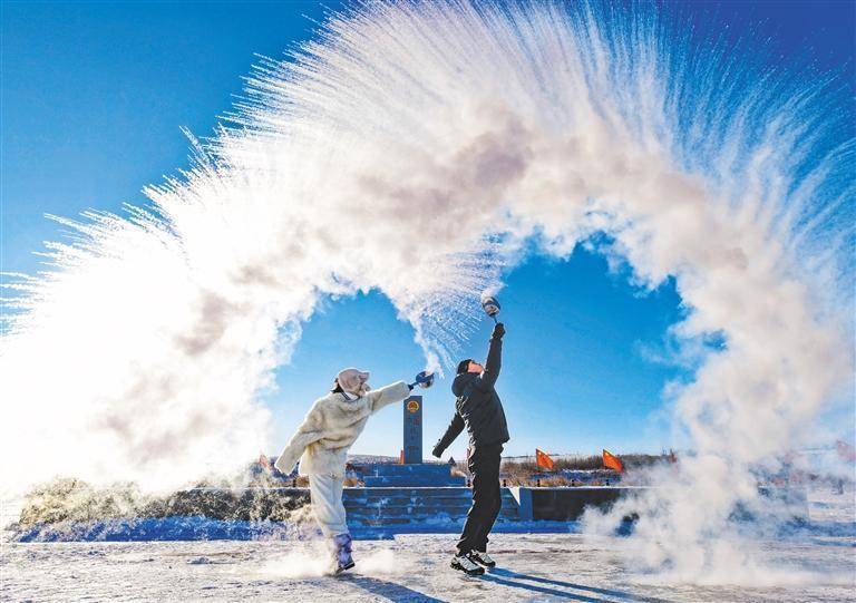 2025年12月23日,旅客在内蒙古呼伦贝尔额尔古纳市黑山头港口景区体验“泼水成冰”。