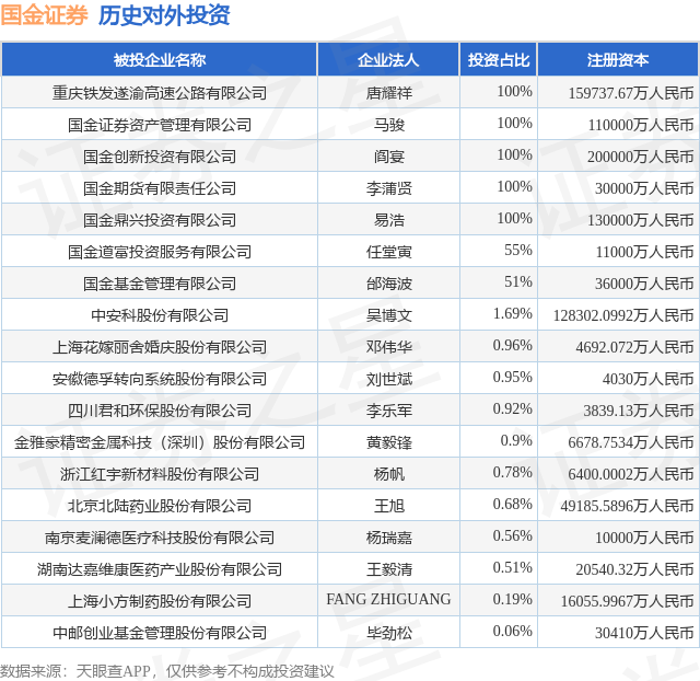 本站音问,左证天眼查APP表露,国金证券(600109.SH)新增一皆对外投资事件,被投资公司为浙江红宇新材料股份有限公司,法定代表东谈主杨帆,投资占比为0.78%。该公司从事非金属矿物成品业,注册成本为6400.0002万东谈主民币。现在,国金证券共存在对外投资18项,详见下表: