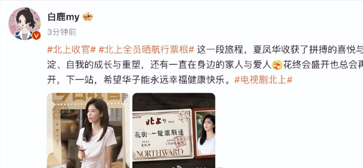 当先便是演出女主夏凤华的白鹿,在点映大结局当日,就发过一次,发视频告别夏凤华,视频全是《北上》操心碎屑,展现了夏凤华聪学生时间和小伙伴们嬉笑闹骂到北上创业飞腾的全流程。还发过婚纱照九宫格,照实是全剧最好意思时刻。