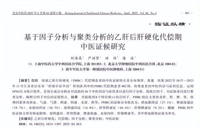 基于因子分析与聚类分析的乙肝后肝硬化代偿期中医证候筹议 刘海亮;严诏贤;洪靖;潘波,北京中医药 2025-04-25