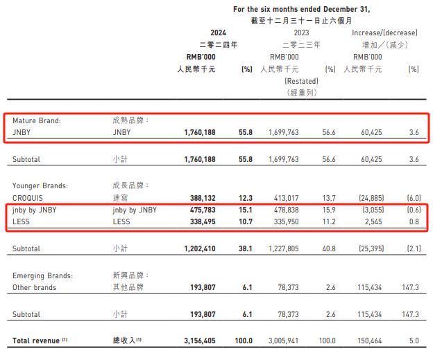 若剔除并表成分,占比55.8%的中枢品牌“JNBY”收入增速从2024财年的17.1%骤降至3.6%;“速写”收入下滑6%,单店店效同比下落8%至122.83万元;“LESS”与“jnby by JNBY”收入近乎零增长。